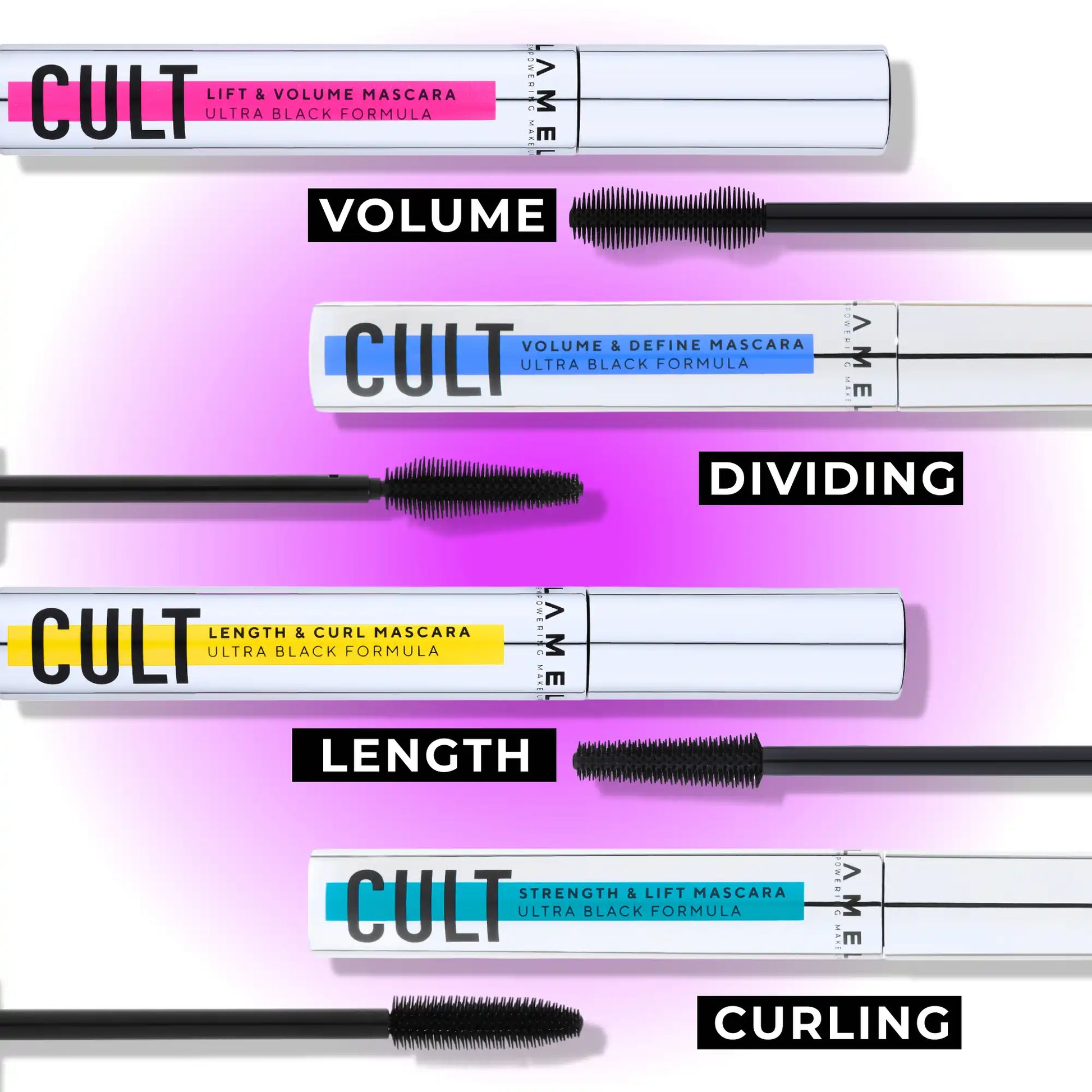 LAMEL Cult Length & Curl Mascara lifts, lengthens, and curls with precision. The flexible silicone brush hugs each lash from root to tip, delivering smooth definition and next-level separation - no clumps, no stickiness.