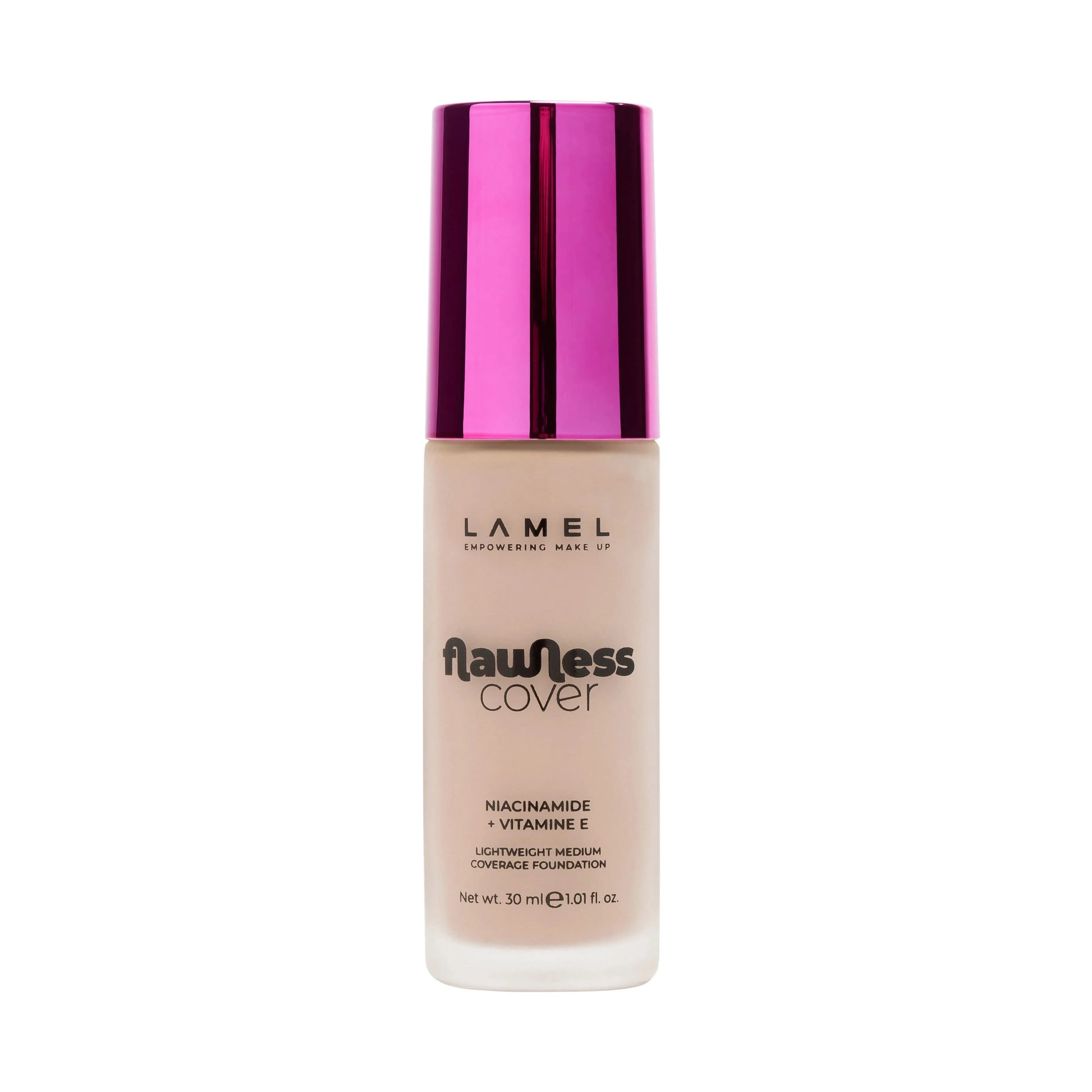 Lamel Flawless Cover Foundation has a lightweight, blurring texture with medium coverage for a flawless look. Niacinamide and Vitamin E provide smoothness and moisturization, while Silica visually evens out skin texture.