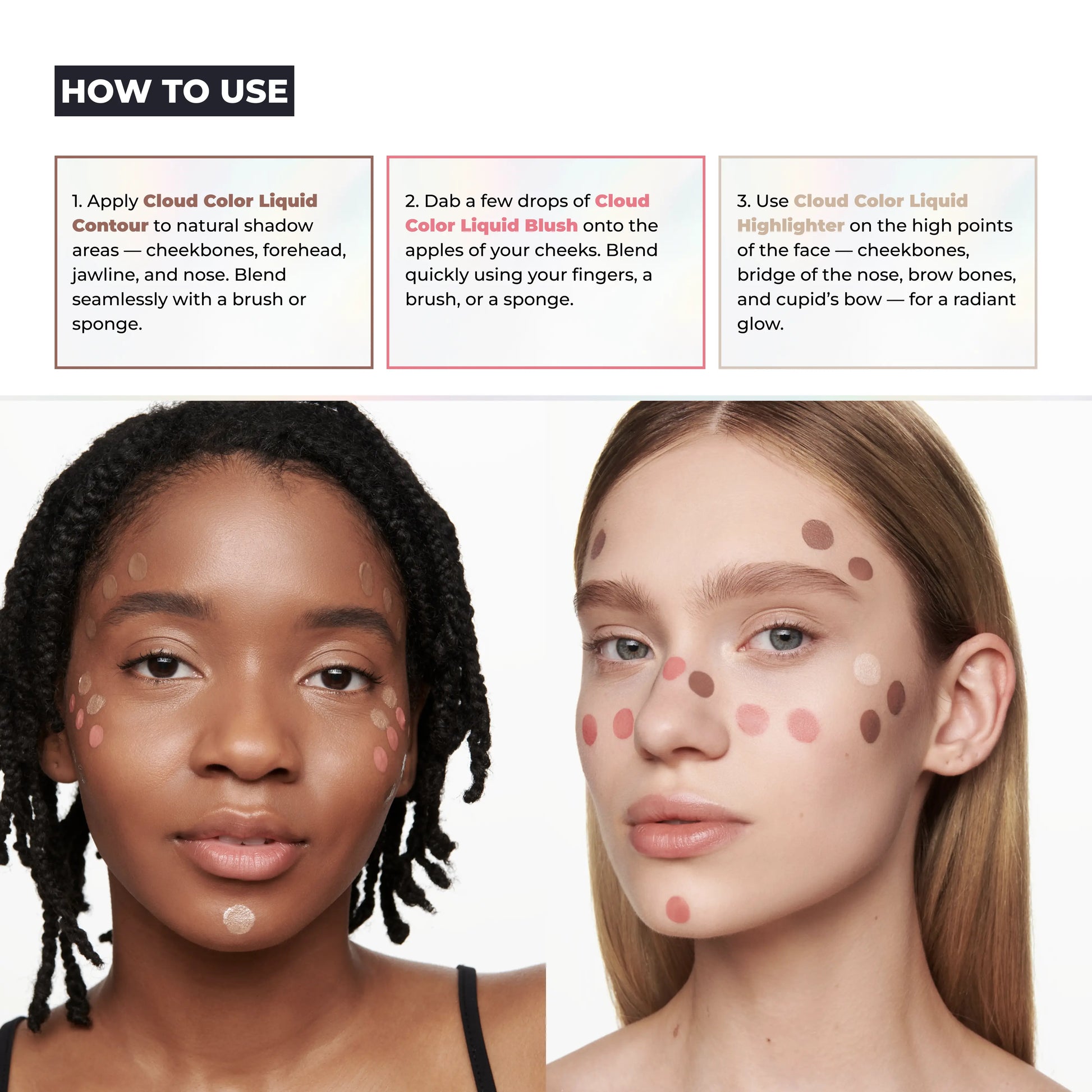 Experience effortless radiance with the Cloud Color Bundle – a lightweight trio that delivers fresh color, soft sculpting, and a dewy glow. The water-based Liquid Blush, Contour, and Highlighter glide on seamlessly, blending with ease for a natural, skin-like finish. Each formula is infused with Vitamin E to nourish and protect while enhancing your features with buildable, breathable color. From subtle definition to luminous highlight, the feather-light textures suit all skin types without settling or feeling heavy. This bundle creates an ethereal glow and weightless dimension that feels as airy as it looks.