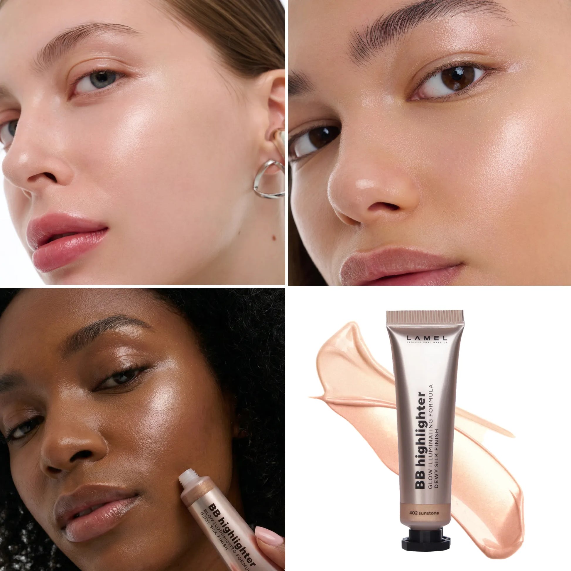 BB Highlighter is a product to create a super glow without «an oily skin» effect. Unique creamy formula glides into the skin, creates glossy-looking skin, and doesn’t emphasize skin imperfections. Can be worn alone, under foundation, or mixed with moisturizer. Enriched with light-reflecting pearl pigments, gives a soft focus glow. - lightweight formula, - luxurious glossy finish - buildable and blendable. Apply the highlighter to the prominent areas of the face with your fingers, and blend with a brush or sponge.
